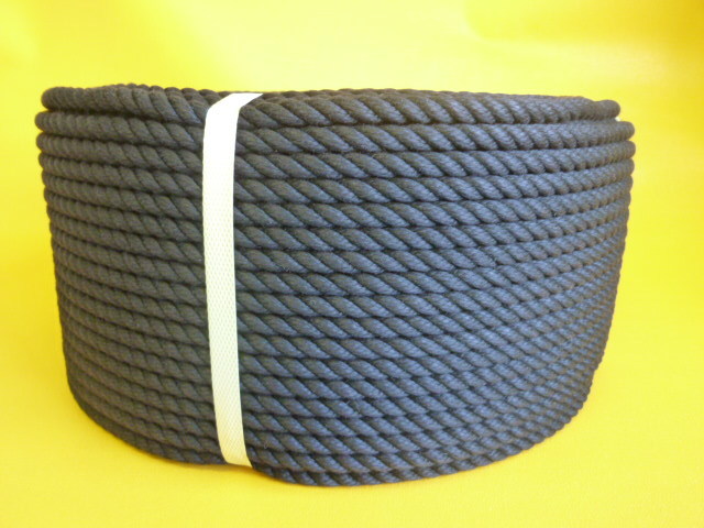 黒色の原着クレモナ糸。深みのある黒色。陸上用ロープの【王様】と言える長年のヒット商品です。 耐候性、耐久性、強度に優れています。 手触りが綿に似ているので適度な柔軟性を持ちとても扱いやすいです。 比重1.26(水に沈む) 重量 約14kg/200M