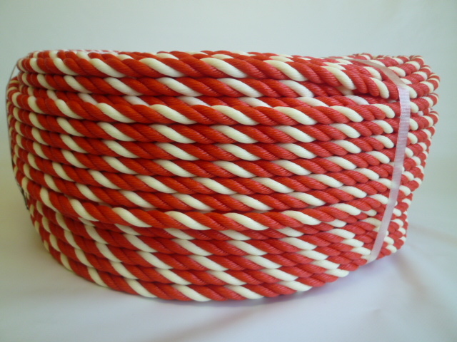 赤色と白色の2色使いのハリコシのあるポリエチレンロープ。 水分を吸わず、汚れが付着しにくい。屋外や強度が必要な場合はこちらがおすすめ。