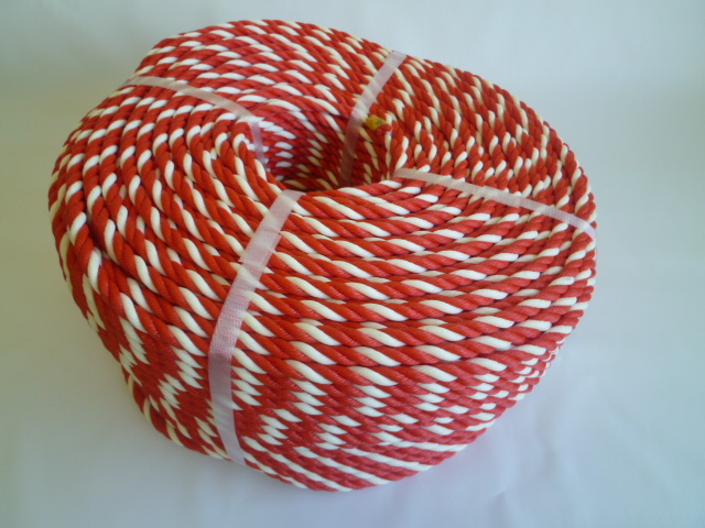 赤色と白色の2色使いのハリコシのあるポリエチレンロープ。 水分を吸わず、汚れが付着しにくい。屋外や強度が必要な場合はこちらがおすすめ。