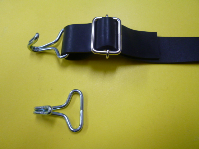 ゴムロープ用フック金具。適用サイズ18~21mmの平ゴム。可動式。工具なしで簡単に取り付けできます。