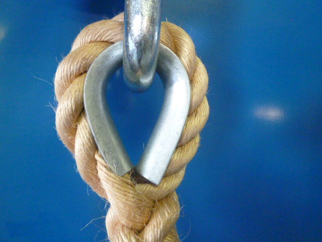 麻ロープ36mmを使用。麻ロープは伸びがほとんどなく、すべりにくいです。難点は毛羽立ちやすい、天然繊維のため劣化が早いことです。