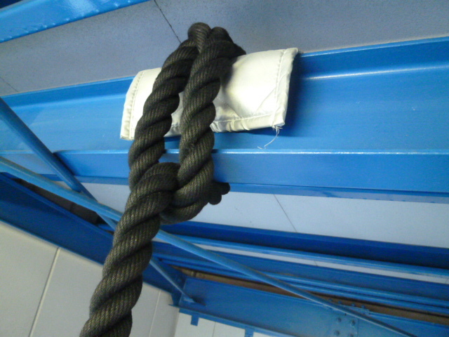梁や柱に巻きつけるのが簡単です。(ロープのスレや梁など傷みを防ぐため当て布取り付ける